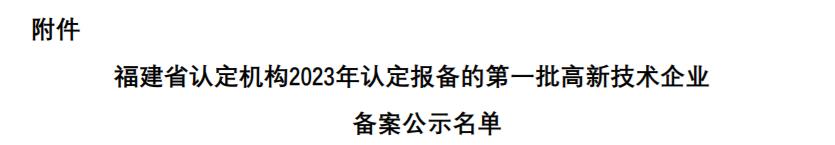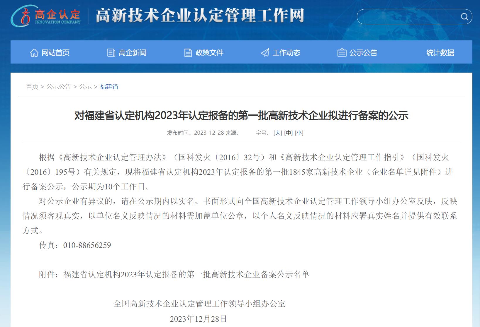 12月28日,高新技术企业认定管理工作网发布“福建省2023年第一批高新技术企业”结果公示,经过严格的资格审查程序,ag真人平台官方再次顺利通过国家高新技术企业认定!