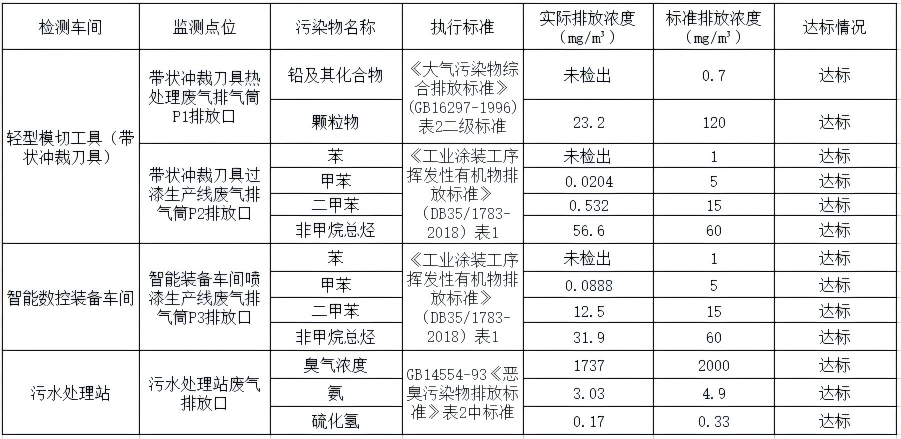 轻型模切工具(带状冲裁刀具)热处理工序生产过程中产生的废气,采用滤筒除尘+碱液喷淋+焦炭吸附+水喷淋处理,达到《大气污染物综合排放标准》(GB16297-1996)表2二级排放要求;轻型模切工具(带状冲裁刀具)过漆工序废气采用UV光解设备进行处理,达到《工业涂装工序挥发性有机物排放标准》(DB35/1783-2018)表1中排放要求;智能数控装备项目喷漆工序采用活性炭吸附+UV光解设备进行处理,达到《工业涂装工序挥发性有机物排放标准》(DB35/1783-2018)表1中排放要求;污水处理站产生的恶臭气体采用活性炭吸附进行处理,达到GB14554-93《恶臭污染物排放标准》表2中标准排放要求。