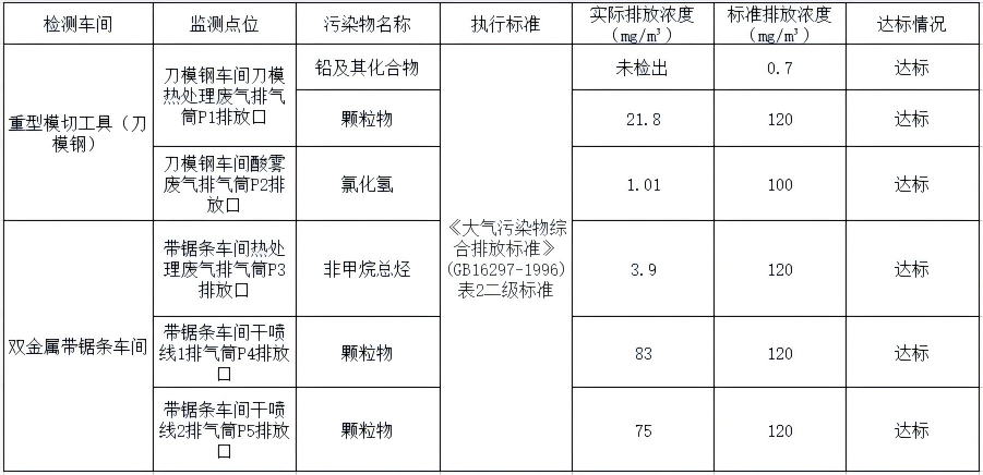 针对重型模切工具(刀模钢)酸洗工序生产过程中产生的废气,采用多面球填料吸收回收+碱液喷淋处理,达到《大气污染物综合排放标准》(GB16297-1996)表2二级排放要求。重型模切工具(刀模钢)热处理工序生产过程中产生的废气,采用滤筒除尘+多面球填料吸收+碱液喷淋+焦炭吸附+水喷淋处理,达到《大气污染物综合排放标准》(GB16297-1996)表2排放要求。双金属带锯条热处理工序油烟废气采用油雾净化器进行处理,达到《大气污染物综合排放标准》(GB16297-1996)表2排放要求,双金属带锯条喷砂工序粉尘采用滤筒除尘进行处理,达到《大气污染物综合排放标准》(GB16297-1996)表2排放要求。